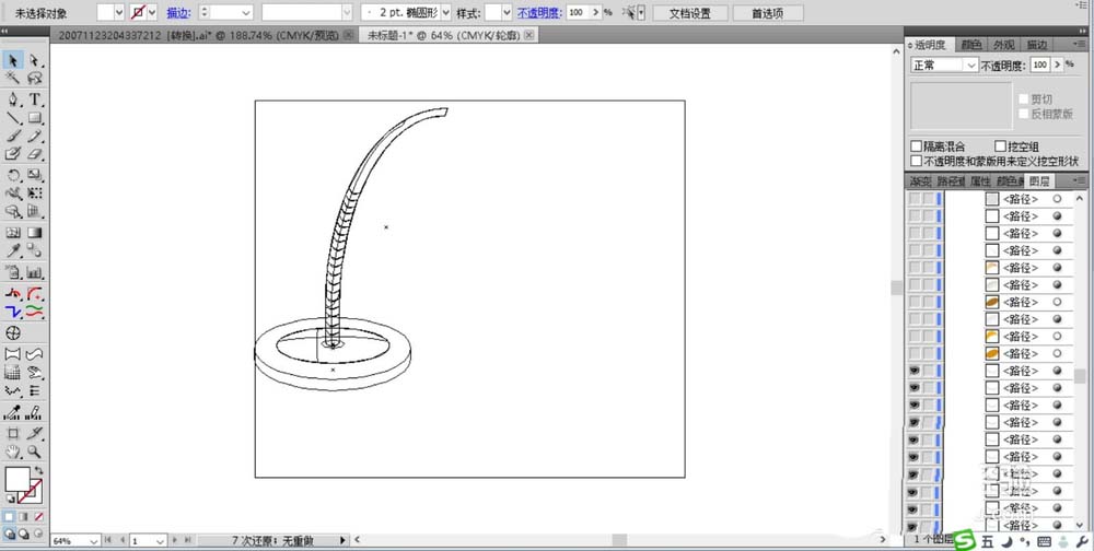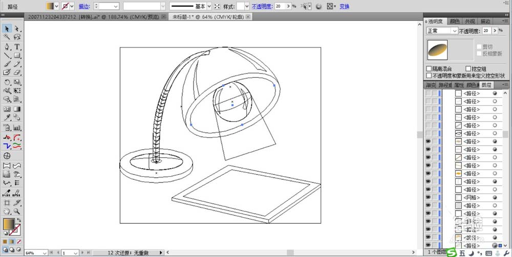 3、继续用圆形工具画出台灯的灯罩的路径,主要是正面与内部两个结构。