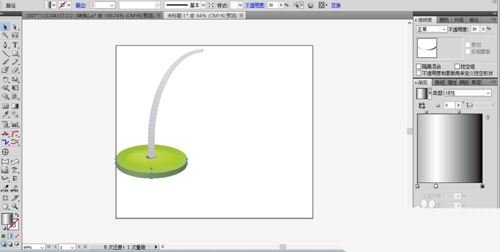 2、我们用灰色与灰白色搭配填充台灯的支架,用绿色与深绿色搭配填充台灯的底部,用变透明的灰色渐变分别填充台灯的底部的顶端与侧面,从而呈现不同的明度效果。