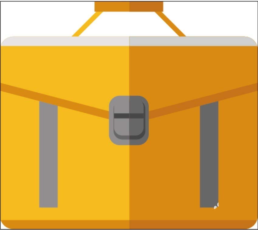 6、我们用不同明度的橙色填充手提包的拎手,用灰黑色与灰色搭配填充搭扣路径,再用暗橙色填充手提包的右侧暗光路径,完成手提包简笔画。