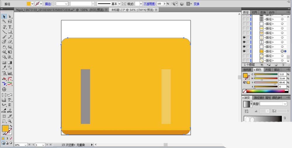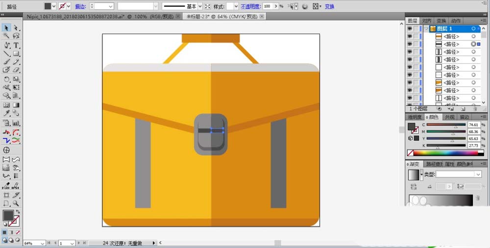 2、我们用橙黄色填充手提包的基本轮廓,再用灰黑色与灰白色分别填充手提包正面的两条飘带,底部的路径用暗橙色填充。