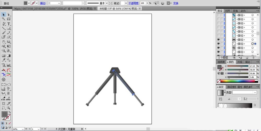 2、再用灰黑色与灰色搭配填充三角架的暗区与亮区的路径。