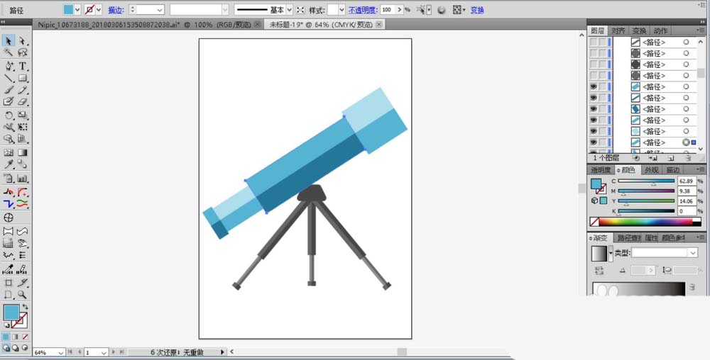4、再用海蓝色与天蓝色搭配填充天文望远镜的主体路径,让望远镜的中间的海蓝色,两端为天蓝色。