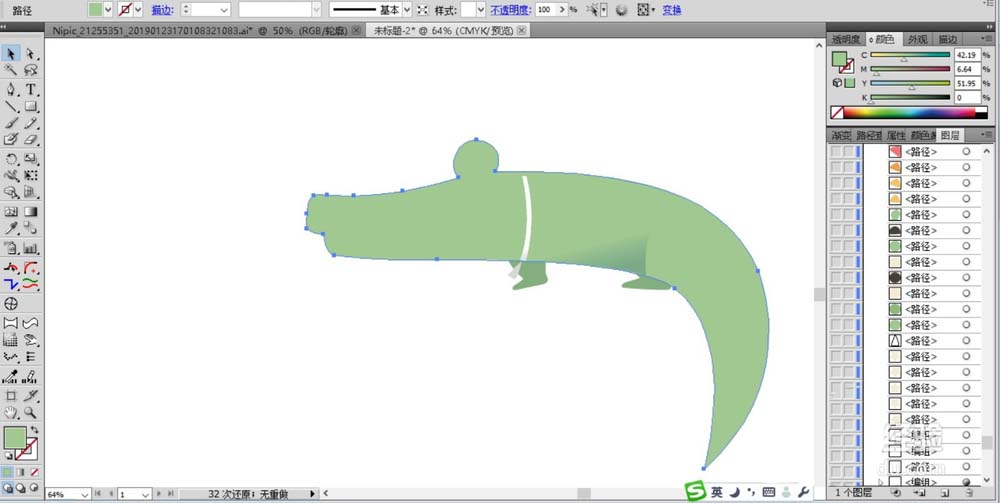 6、这一步,我们使用钢笔画出鳄鱼身上的所有的弧形的鳞片的路径并用灰白色一一填充,绘制出鳄鱼的嘴巴的下嘴唇的细节并用绿色的渐变填充。