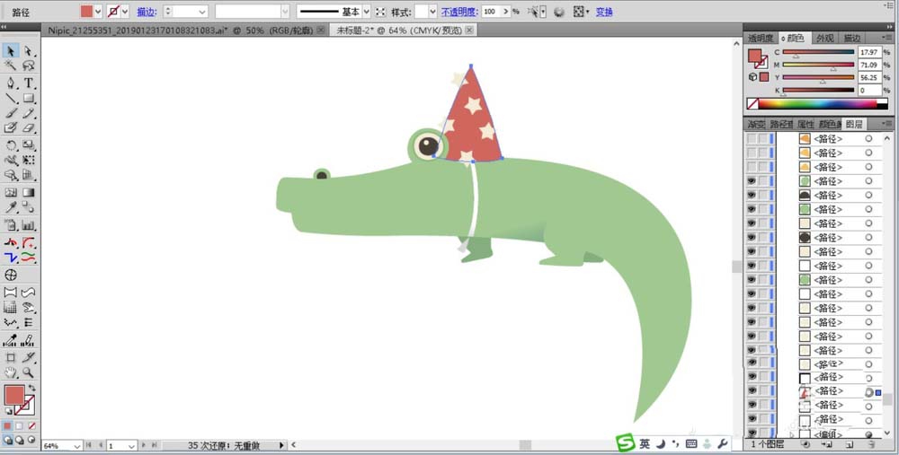 4、使用钢笔画出鳄鱼头上的小小的尖顶帽子还有修饰的星星的路径,我们用糯红色填充帽子,用灰白色填充星星。