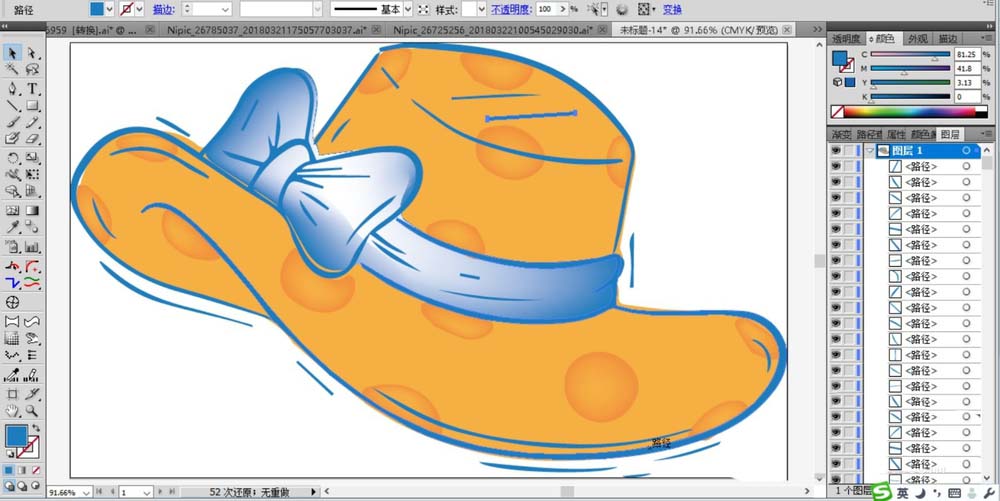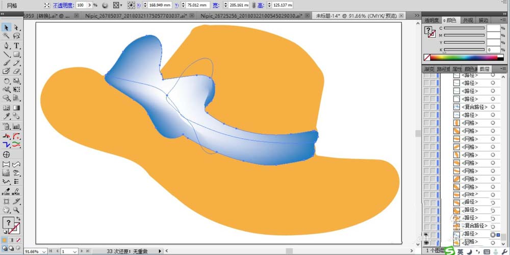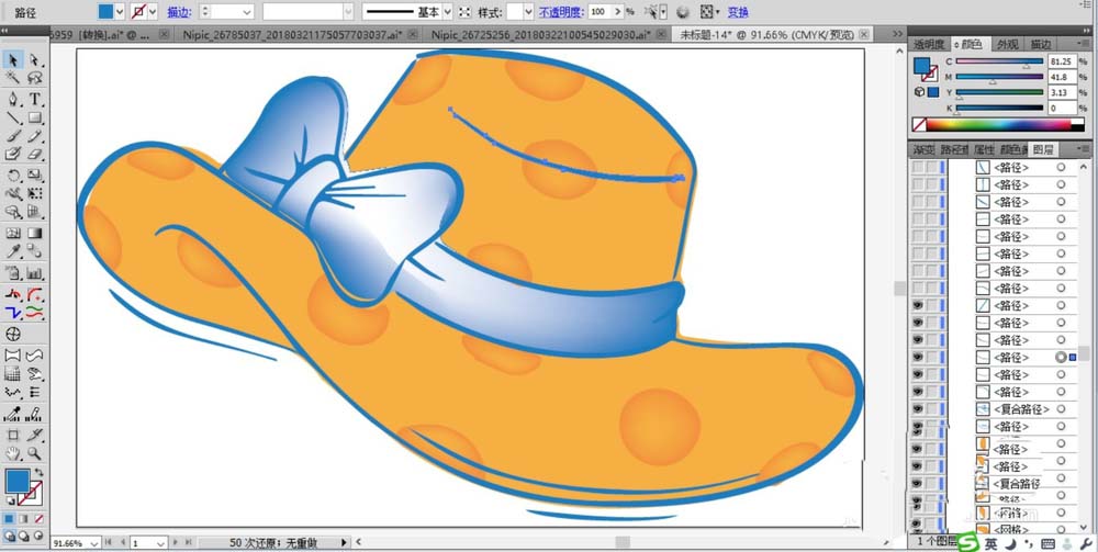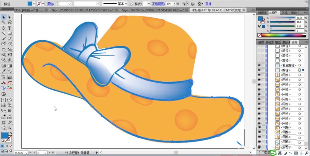2、继续画出礼帽左侧的一个蝴蝶结的路径与帽子的边缘路径。我们用海蓝色进行填充,并用海蓝色到白色的渐变填充,我们使用网格工具来完成。
