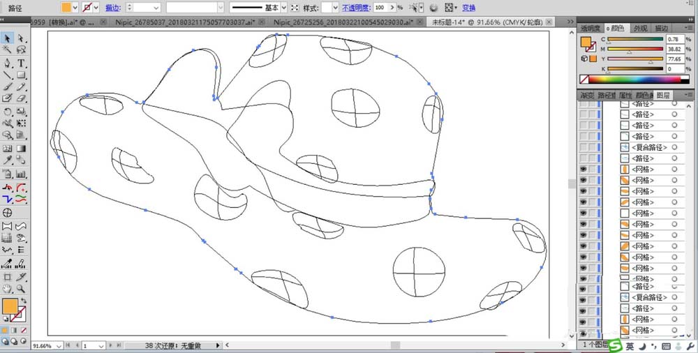 3、使用圆形工具在礼帽上面画出很多的不规则的圆形的图案路径。