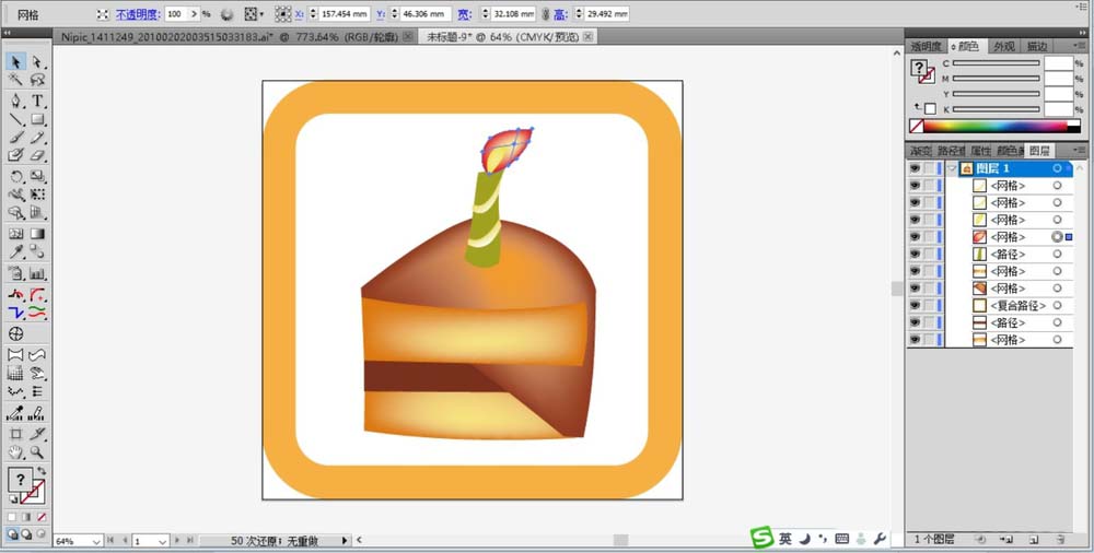 7、我们用网格工具给蜡烛的条纹与火苗分别做一下渐变效果,再用矩形工具画出边框并填充橙黄色,完成小蛋糕图标设计。