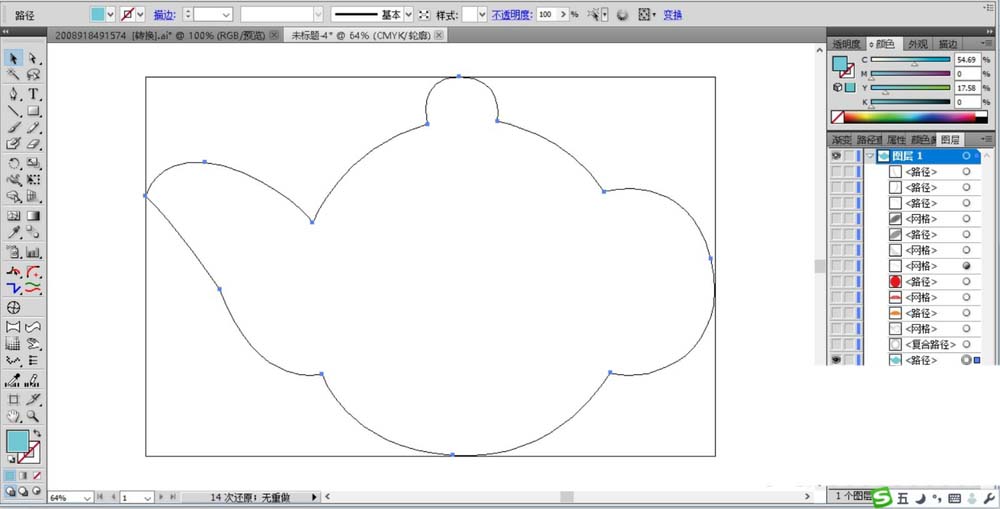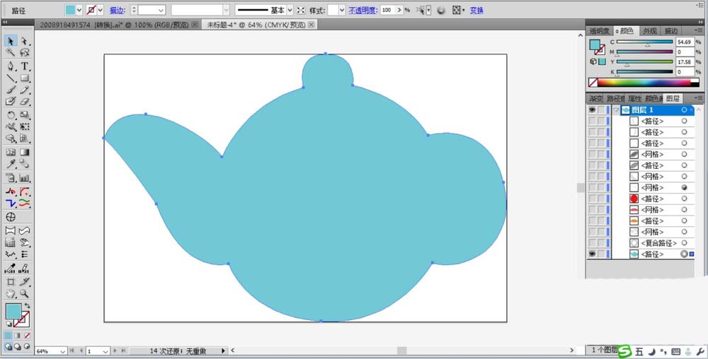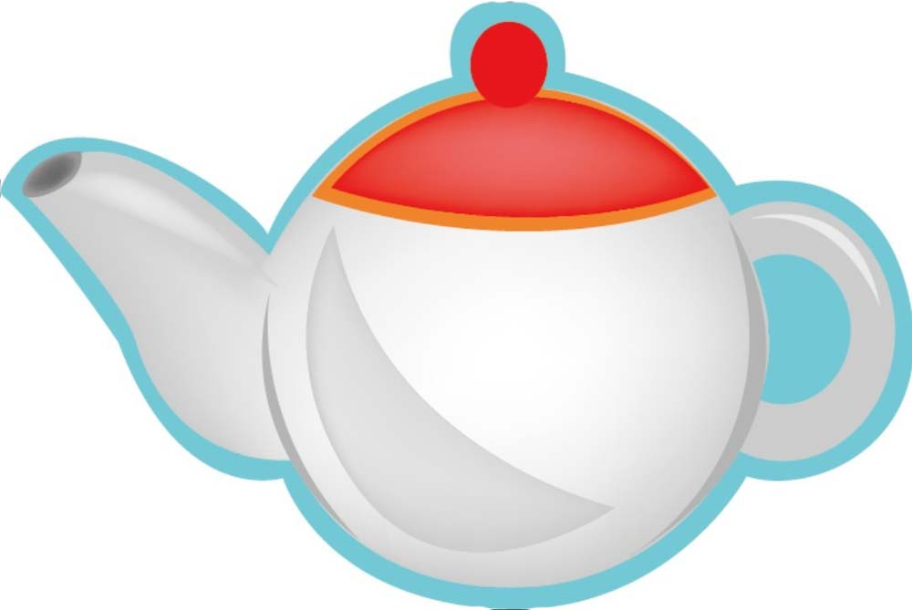 1、先使用钢笔工具画出茶壶的基本轮廓,重点位置是茶壶的盖子、手柄、喷嘴等部位,我们用天蓝色填充茶壶的基本轮廓。