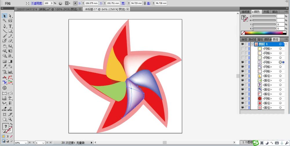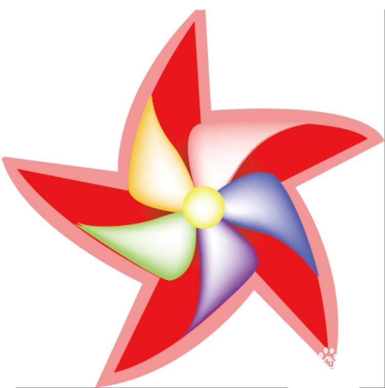 2、用红色与粉色搭配填充风车的内外两个主体路径,中间的圆形用网格工具做出红到灰黑色的渐变效果。