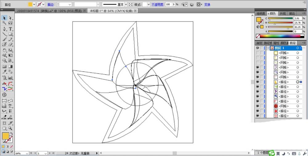 3、继续画出风车中心的一个个小的叶片路径,我们让它布满整个风车的圆心区域。