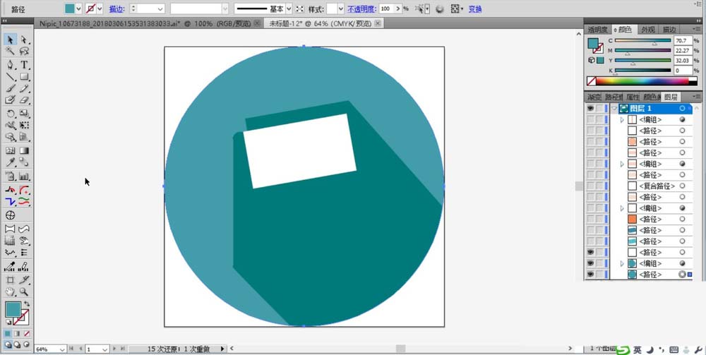 2、用淡青色填充圆形的背景,用深青色填充皮夹的阴影,再用白色填充卡片的阴影路径。