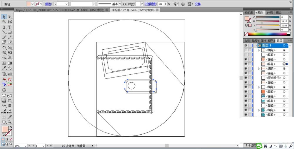 1、先用圆形与钢笔画出图标的背景与皮夹的阴影路径,我们再把皮夹内部的卡片的轮廓也画出来。