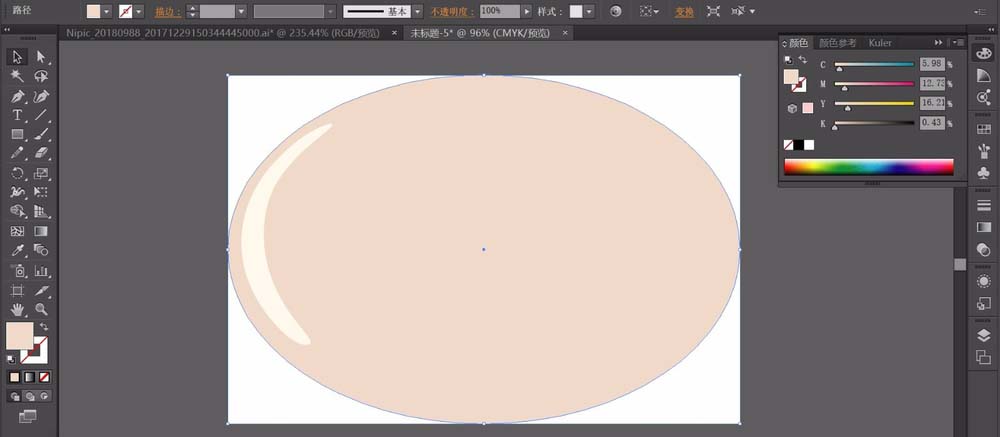 1、先用圆形工具画出这个圆形的盘子,我们用淡咖啡色填充盘子,左侧的亮区用灰白色填充,设置效果为叠加来呈现高光的感觉。