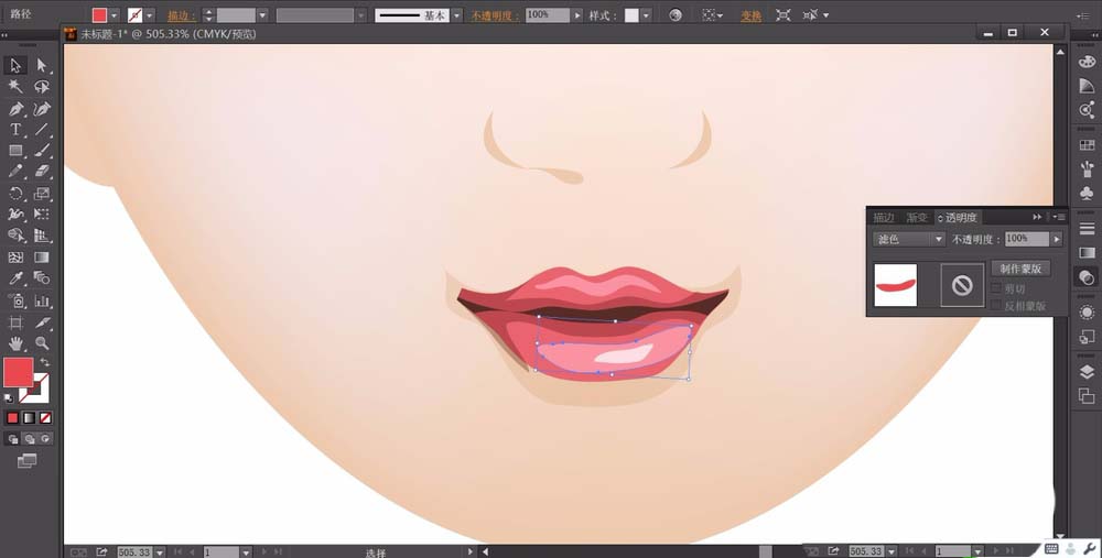 3、进一步使用钢笔工具画出女孩的嘴唇路径,我们可以多绘制几个层次,从高光区域到暗光区域的路径都绘制出来,我们用红色的滤光效果填充高光路径,用红色填充主体路径,用暗红填充中间暗光路径。