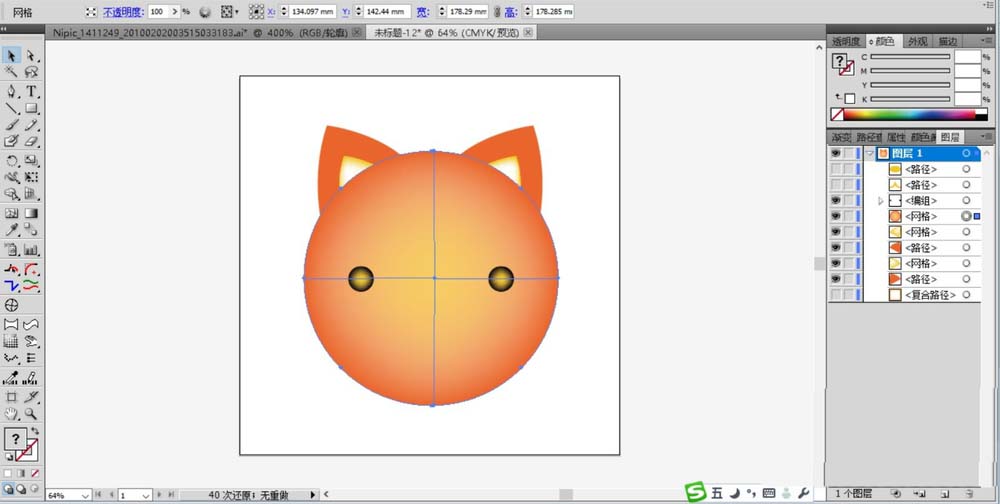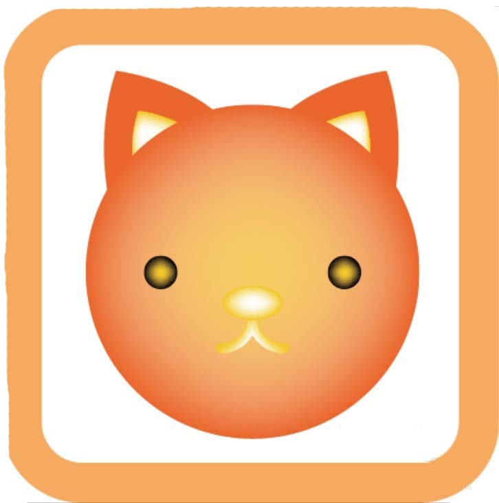 6、使用网格工具点击小熊的头部圆形,做出一个橙色到黄色的渐变效果,眼晴做出一个灰黑色到黄色的渐变,再继续画出小熊的鼻子与嘴巴的路径并用黄色到白色的渐变填充,完成小熊头像设计。