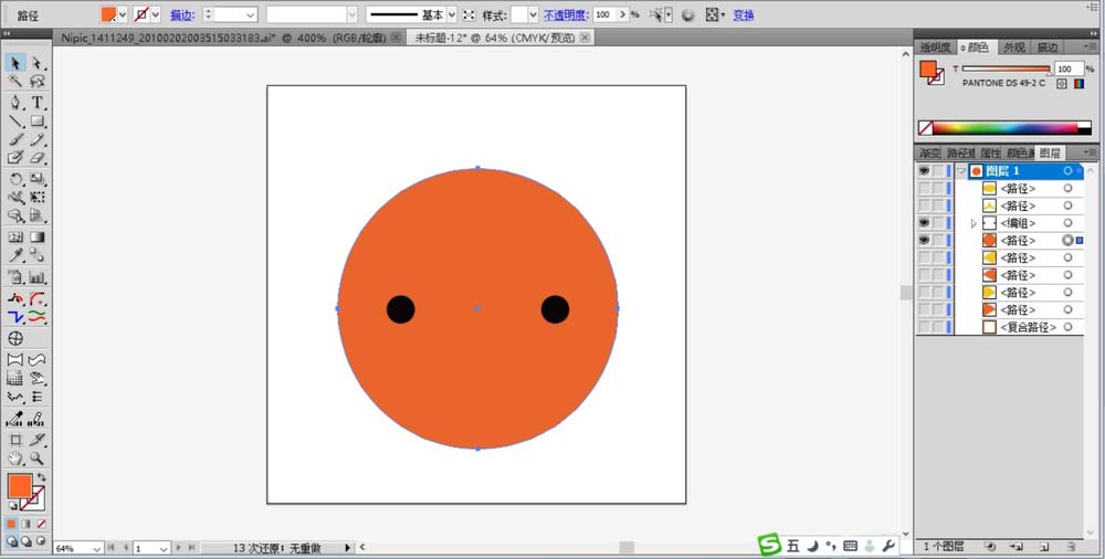 2、用橙色填充圆形脑袋,用灰黑色填充眼晴路径。