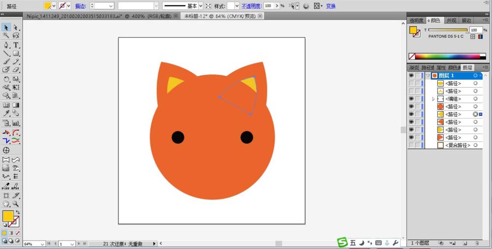 5、用橙色填充耳朵的外部轮廓,用黄色填充耳朵的内部轮廓。