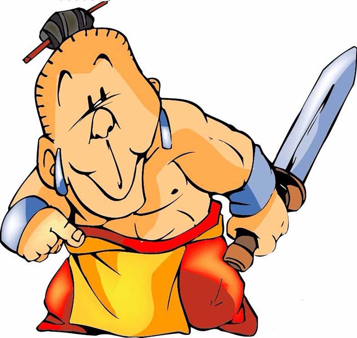 3、继续用橙色填充人物的皮肤,分为淡色与深色两个区域,我们用咖啡色填充剑的手柄。