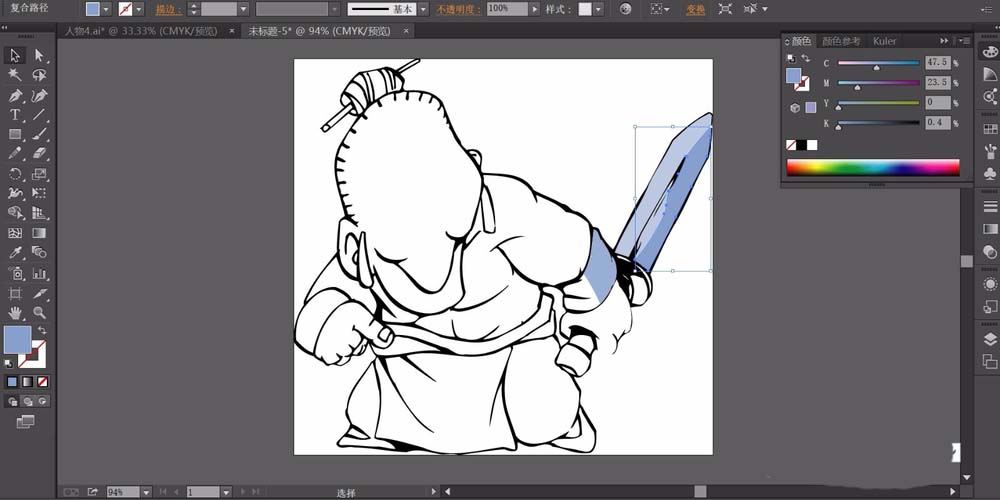 1、选择钢笔工具画出武侠的动作轮廓,还有细节元素的服饰、剑、发式等元素。