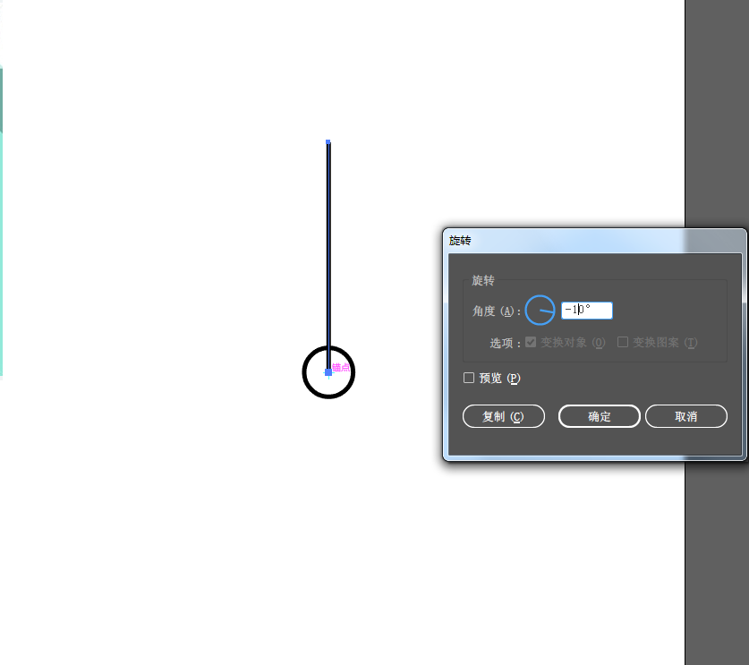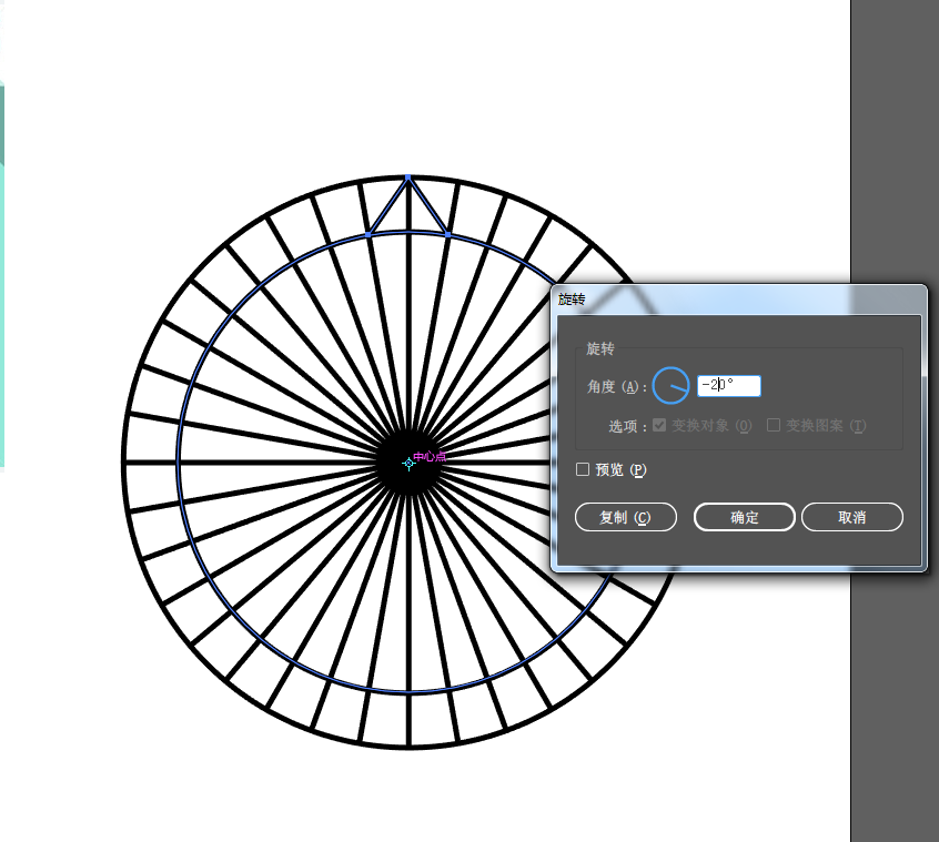 3、从圆心中拉出一条直线,使用旋转工具,将光标放在圆心位置,按住alt键,在弹出的对话框中输入,旋转角度-10度,并单击复制按钮。