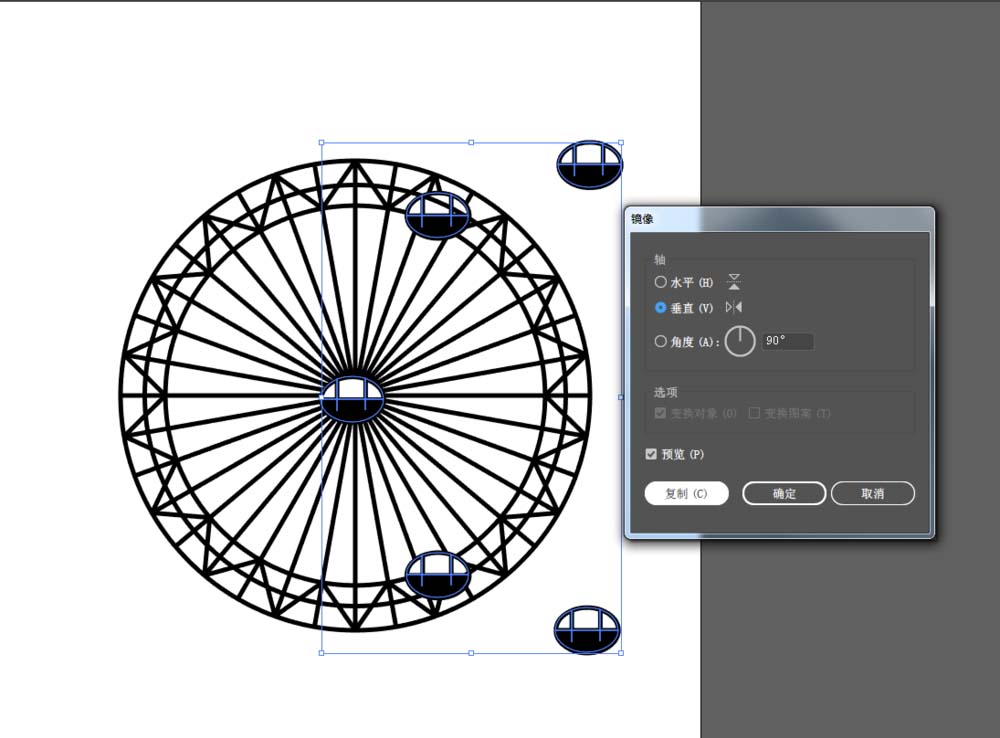 8、将筐放在三角的尖处,使用对象——变换——对称,点击复制,使用方向键将其复制到另外一个半圆中