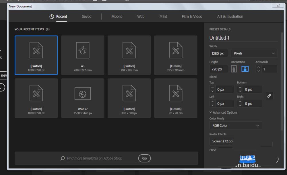 1、首先我们打开AI软,这里选择文件的大小,颜色模式RGB模式。