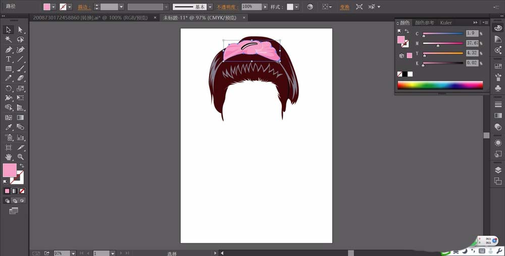 2、我们用咖啡色填充女孩的头发路径,用灰白色填充头发上面的高光路径。用三种不同明度的粉红色搭配填充蝴蝶结,让高光、过渡、暗光的路径都一一呈现在蝴蝶结上面。