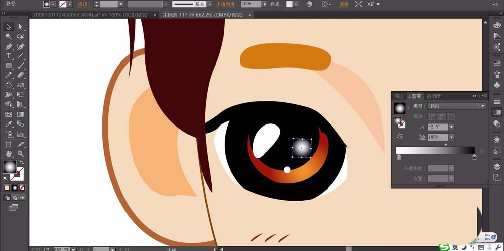 4、继续画出眼晴的细节路径,我们用橙色的渐变与灰黑色的渐变搭配填充眼晴的不同层次,用白色与半透明的白色来呈现眼晴的高光。眉毛用变暗了的粉色填充。