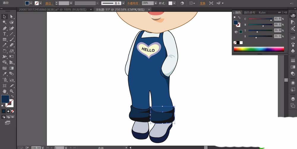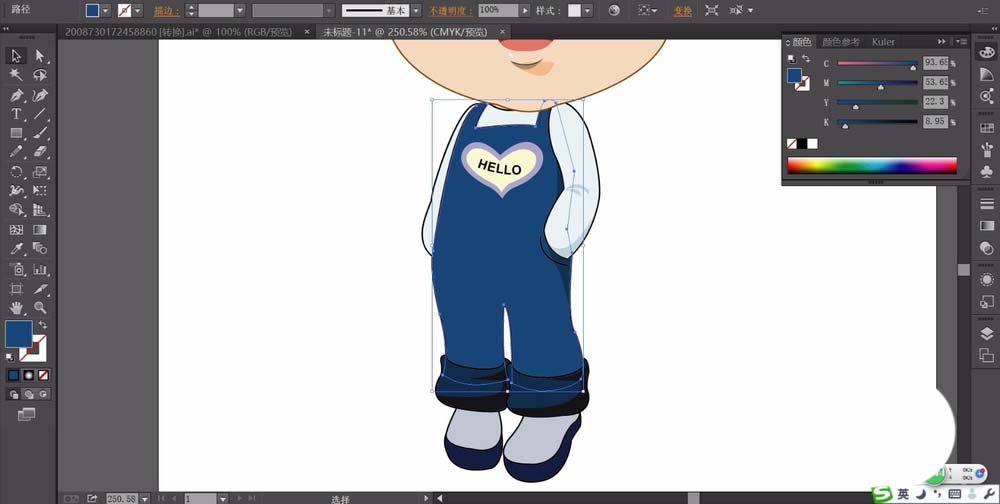 6、我们用淡蓝色与蓝色搭配填充女孩的衣服与连衣裤的路径。