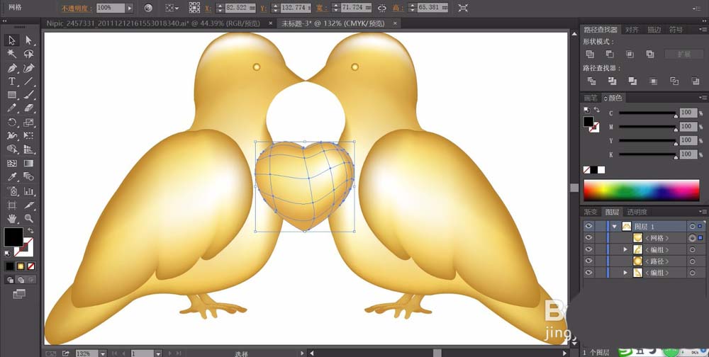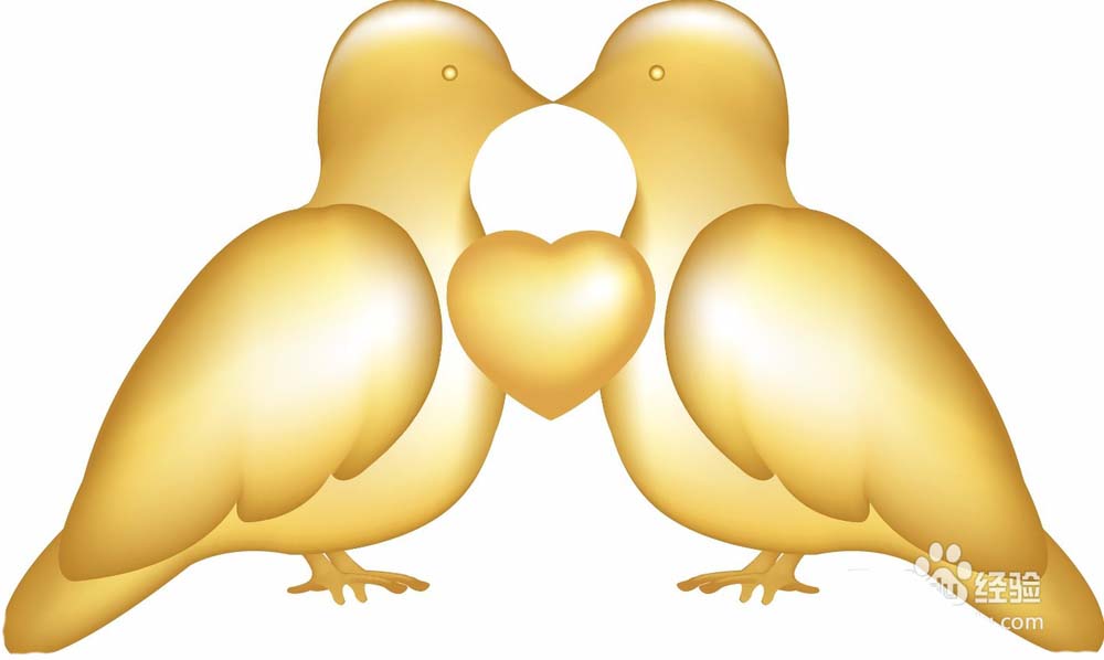 6、复制一下金鸟,让其成为两只左右对称的金鸟,再在两只鸟儿的中间画出一颗爱心,我们用网格工具填充爱心为金色的渐变,完成金鸟图片设计。
