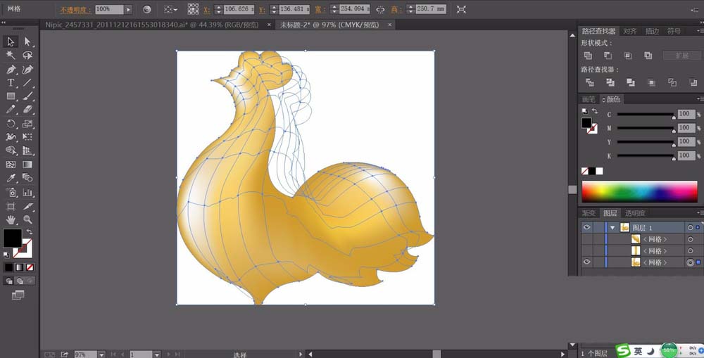 1、先用钢笔画出一只金鸡的站立剪影,我们用金色填充后,再用网格工具把这个金鸡细分成很多不同的区域,鸡冠、头部、身体、尾巴、脚等结构。