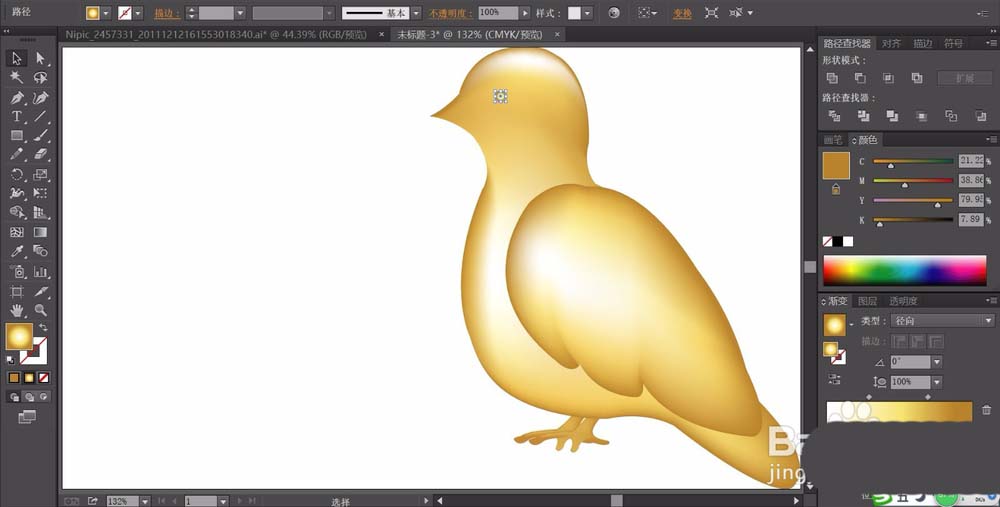 5、我们使用网格工具给金鸟的头部、身体左侧、翅膀做出高光的效果。
