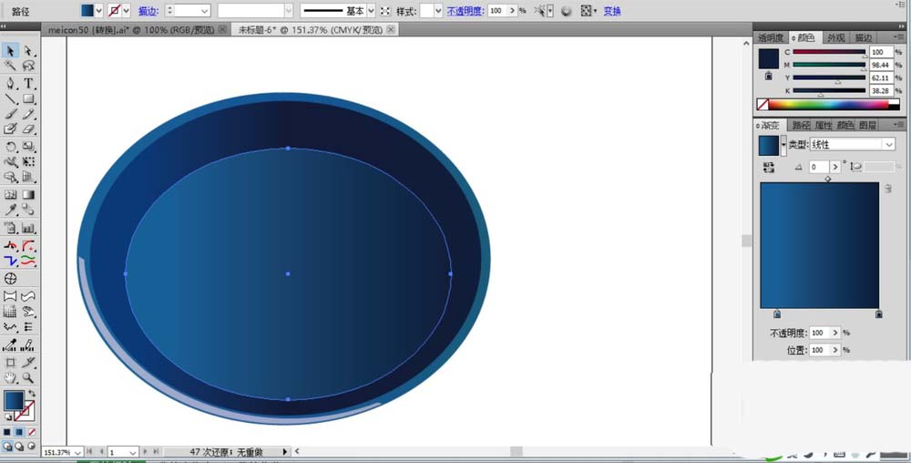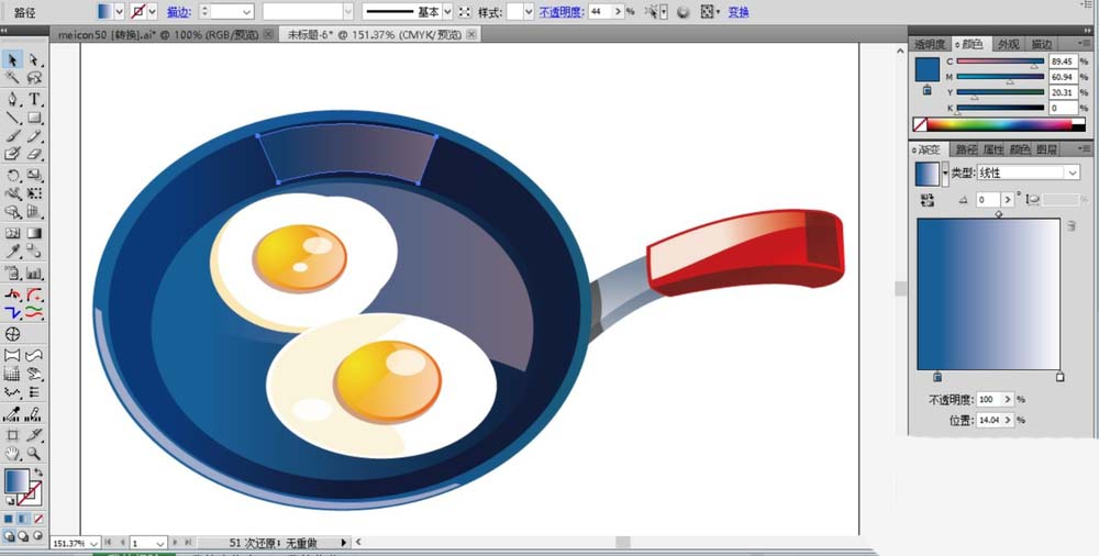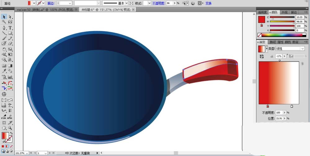 4、设置一个蓝黑色的渐变,我们用不同明度的蓝黑色的渐变填充煎锅的底面、侧面,还有顶端的边缘部分。