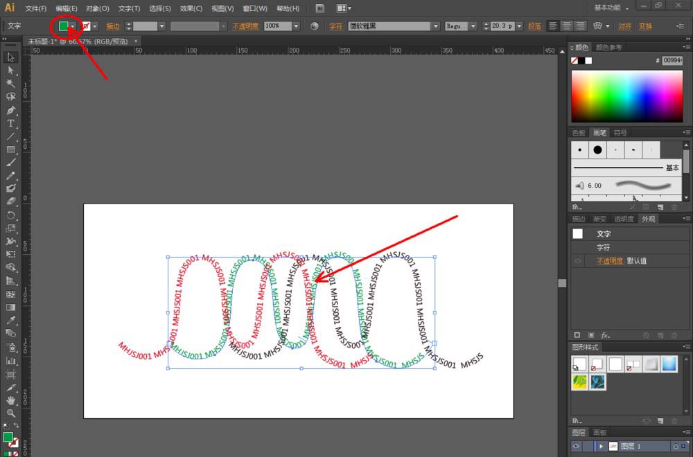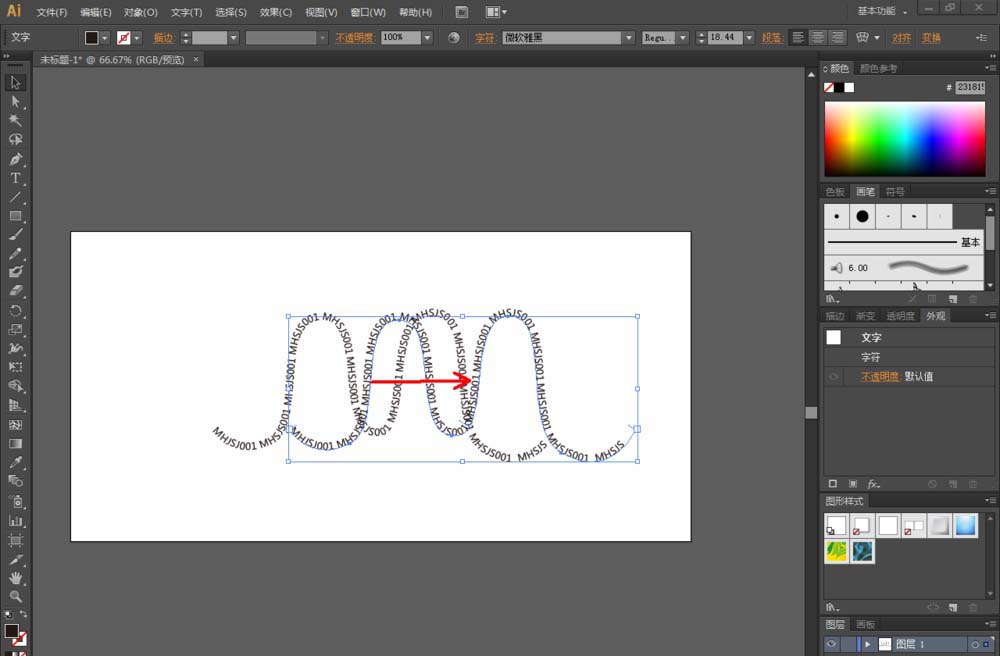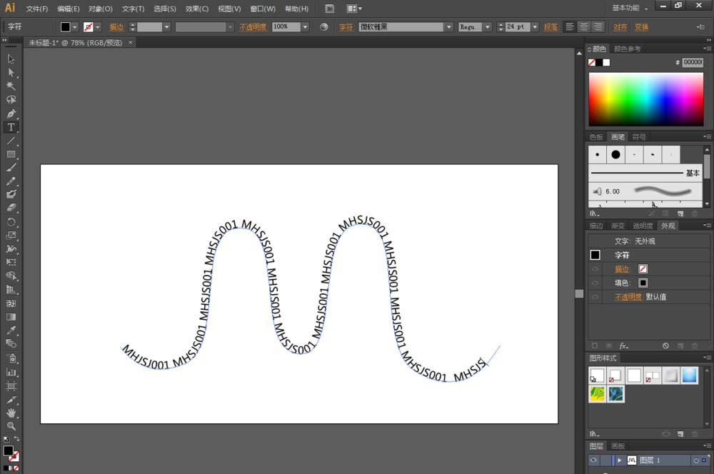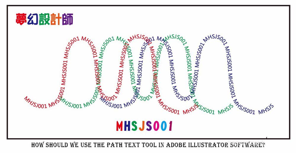 3、点击【路径文字工具】后,鼠标点击画面中的路径并设置好上方文字的字体、大小等各个参数,连续输入文字内容:MHSJS001(如图所示);