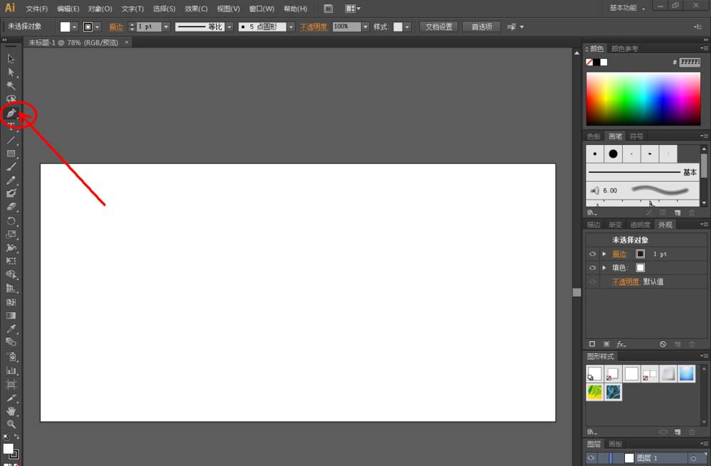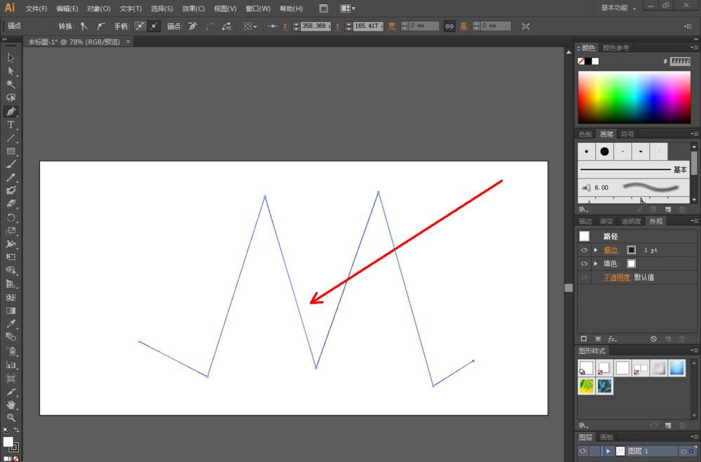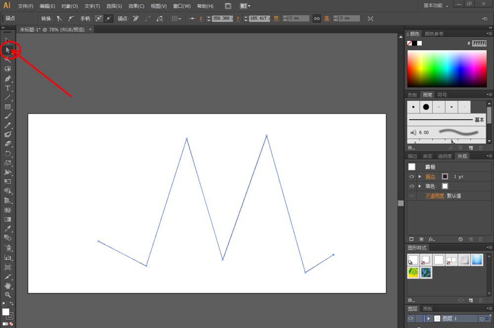 2、点击【钢笔工具】,在作图区域绘制出一个线段图案。点击【直接选择】工具,选中图案上的点,点击【将所选锚点转换为平滑】。按图示操作调整好锚点的平滑幅度(如图所示);