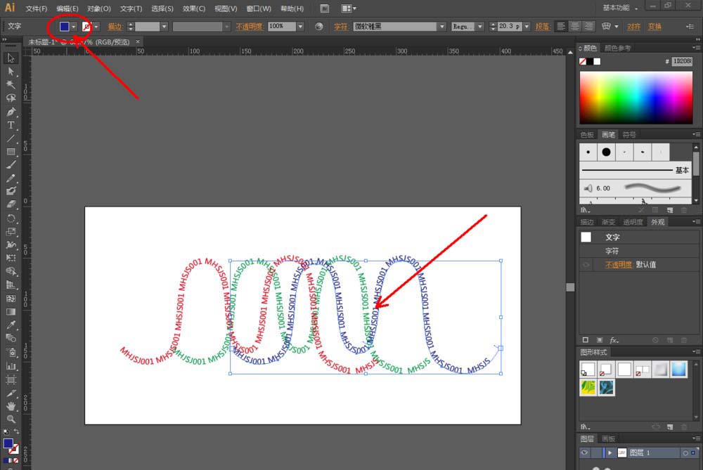 5、最后,选中文字路径1,点击上方色板中的红色,将其填充为红色。选中文字路径2,点击色板中绿色将其填充为绿色;选中文字路径3,点击色板中的蓝色,将其填充为蓝色。这样我们就完成了整个文字路径图案的制作。