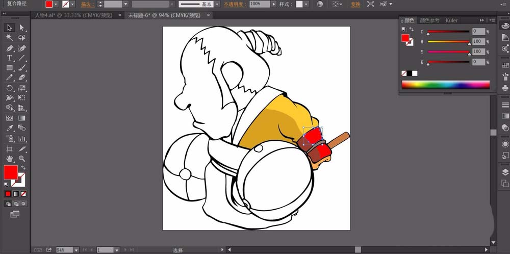 2、用橙黄色填充人物的手臂路径,用橙红色填充这个服饰的袖口,用咖啡色填充铁锤的手柄。