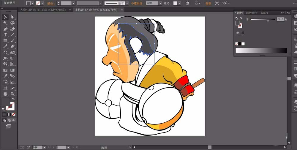 3、继续使用两种不同亮度的灰黑色填充这个人物的发式路径,用橙黄色填充人物的脸蛋。