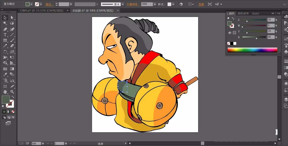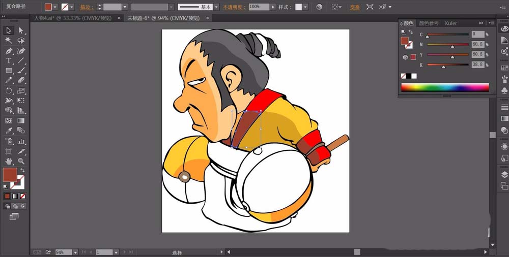 5、继续使用橙黄色与黄褐色搭配填充人物的服饰路径,用橙红色完成服饰中间的装饰线条,注意填充出色彩的亮度变化。