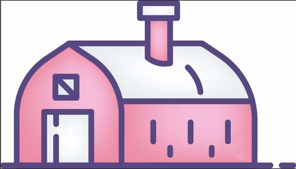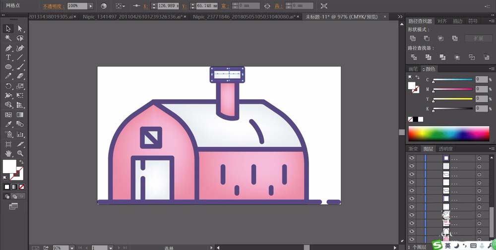 6、使用网格工具点击一下屋顶、墙壁、正门、烟筒等元素,一一给他们做出渐变效果,完成房屋简笔画设计。
