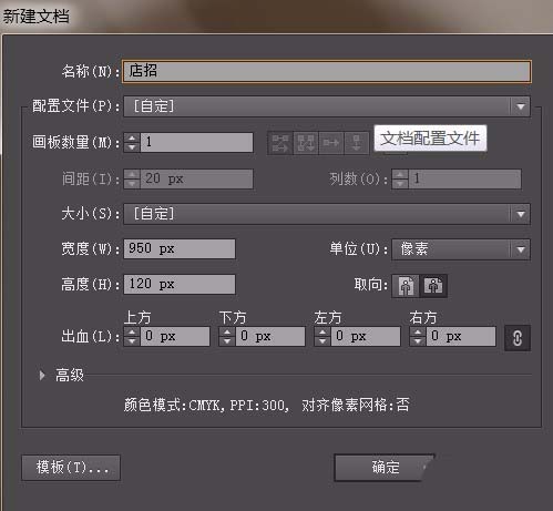 1、我们需要知道的是,店招的尺寸是宽为950像素,高不能超过120像素,我们新建文档,输入宽高像素,然后单击确定。