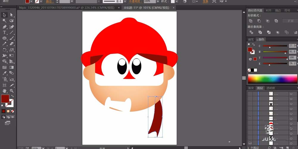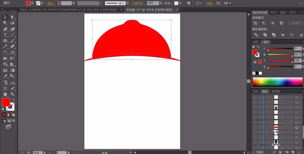 1、先用圆形工具画出一个圆形再通过截取与合并的路径来呈现一个半圆形的帽子的路径。我们用橙红色来填充这个帽子的路径。