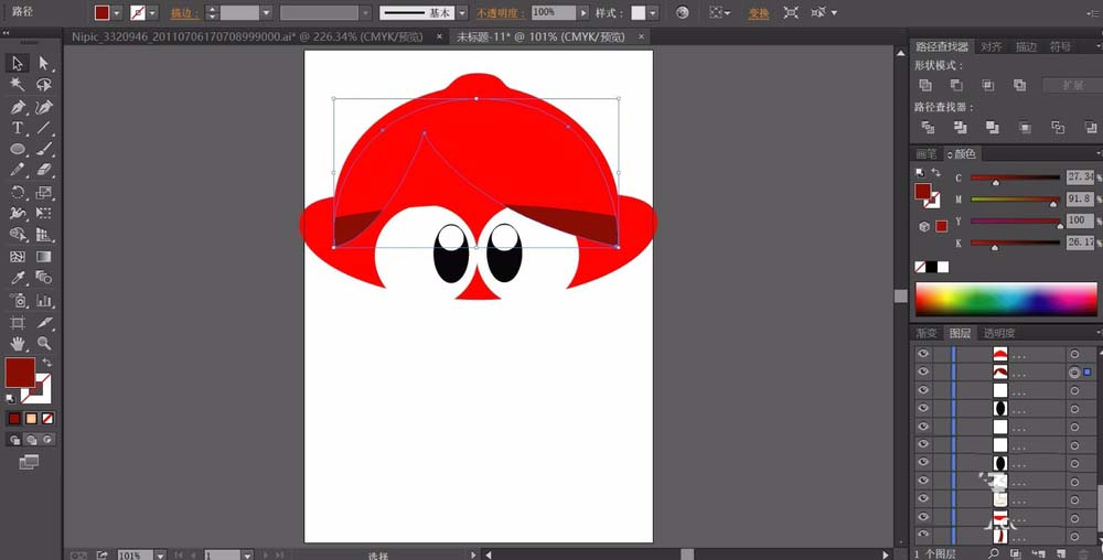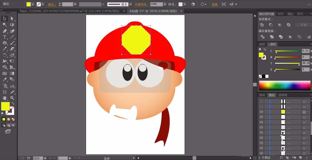 5、继续画出帽子上面的细节路径,我们画出图案的基本轮廓并用黄色来填充。