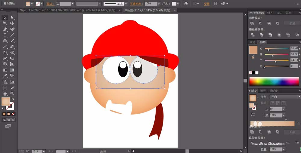 3、再继续用圆形画出工程师的脸蛋路径,还有帽子上面的飘带的路径,我们用土黄色的渐变填充脸蛋,用暗红色填充飘带的路径。