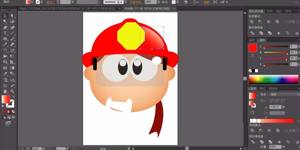 6、画出帽子上面的高光区域,我们用橙红色到白色的渐变填充这个高光的路径。