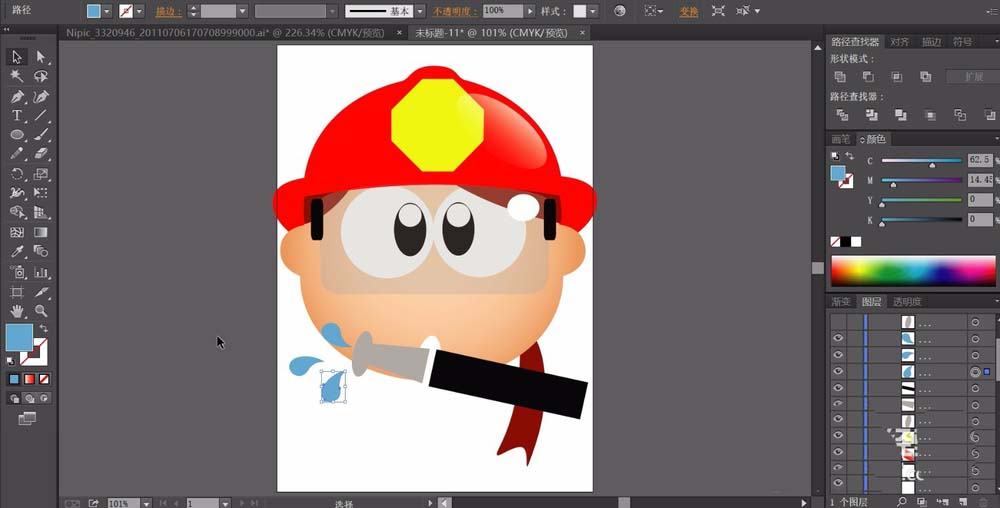 7、最后,我们画出水管的后面的部分的路径,我们用灰色与灰黑色搭配填充水管的路径,用钢笔画出水管出来的水滴,我们用蓝色填充水滴,完成工程师头像设计。