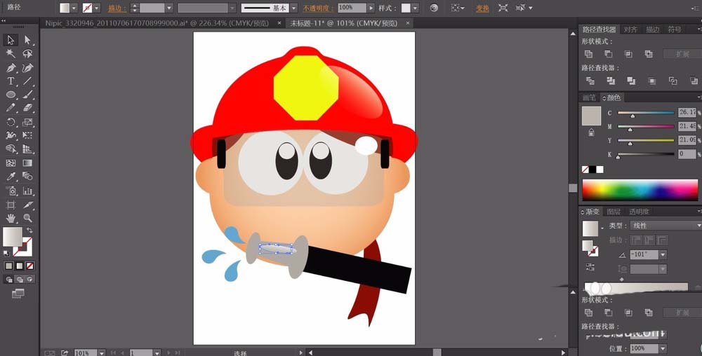 4、这一步,我们来画一画帽子的面罩的路径,我们用灰色的渐变填充面罩。接着,再来画一画水管的路径,用白色来填充水管的出水口。