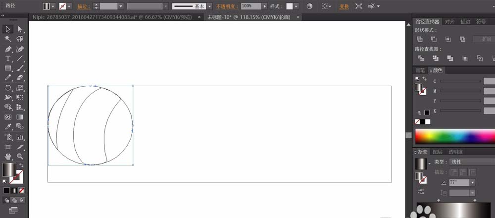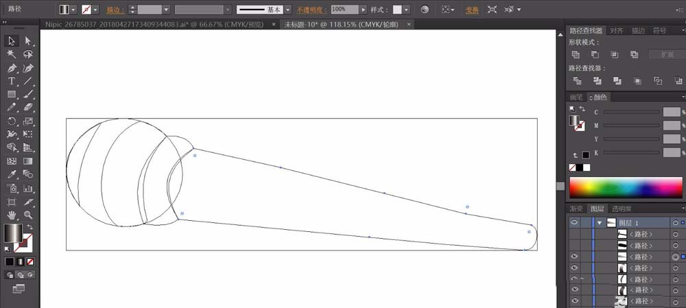 1、先用圆形画出话筒的头部的圆形结构,我们设计成圆形与曲线来呈现话筒的立体感觉。这是形状与色彩的明度叠加的路径。