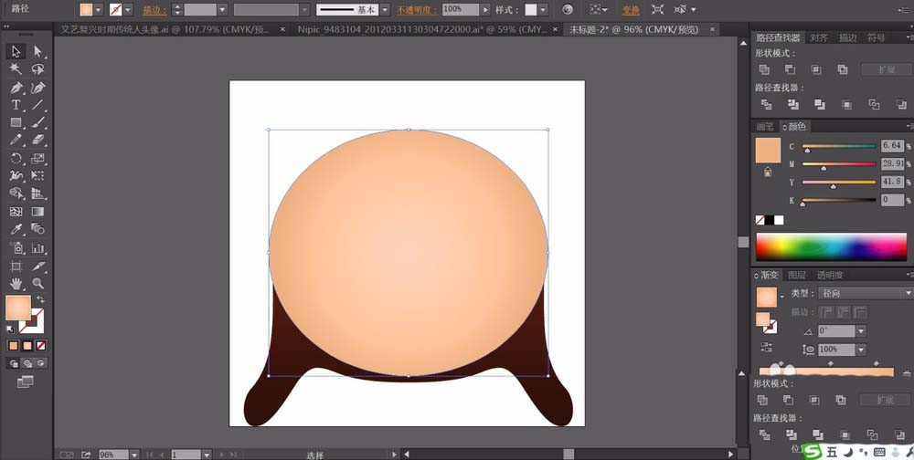 2、继续使用圆形来画一画小孩的脸蛋,我们用粉色的渐变填充这个脸蛋的路径。