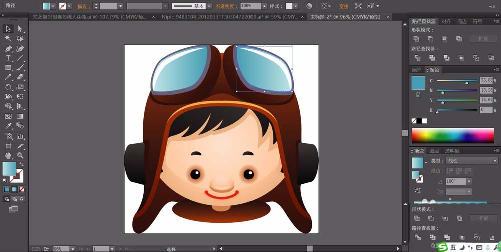 6、最后,我们来画一画这个小孩的帽子、眼镜、耳罩等元素的路径,我们用蓝色的渐变填充眼镜,高光路径用白色填充。